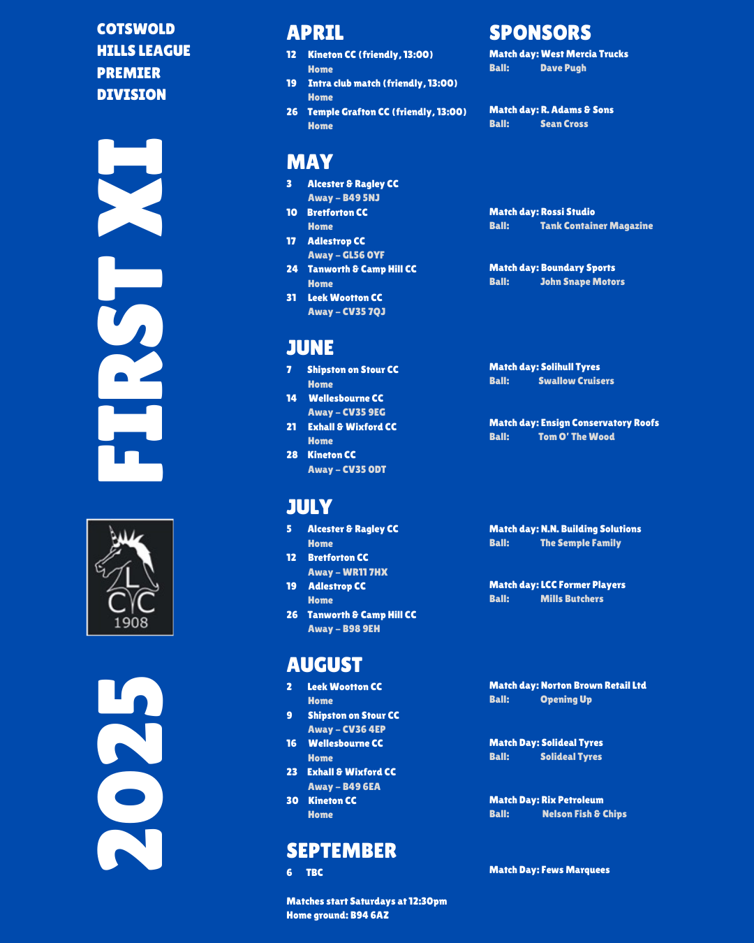 The 1st XI play in the Cotswold Hills Premier Division. The team first joined the Cotswold Hills League in 2012 and have enjoyed successive promotions to reach the Premier Division in 2018.