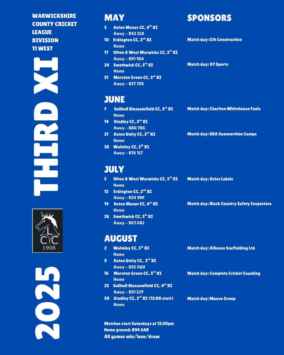 The 3rd XI play in Division 11 West of the Warwickshire County Cricket League. The team was formed in 2019 after a number of years of growth with new players joining Lapworth.